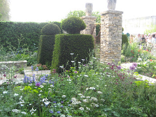Nearly all the gold winning designs had a single axis with a focal point. Many also had cross axes perpendicular to the main axis. Most of the gardens had hedges and some sort of topiary. Interestingly, the herbaceous plantings were very similar as well. They tended to have a low naturalistic meadow feel with a mauve/pink, purple and/or purple-brown palette of planting. Few bright colors were used. This type of planting was reminiscent of many of the gardens I remember from last year's Chelsea Show.