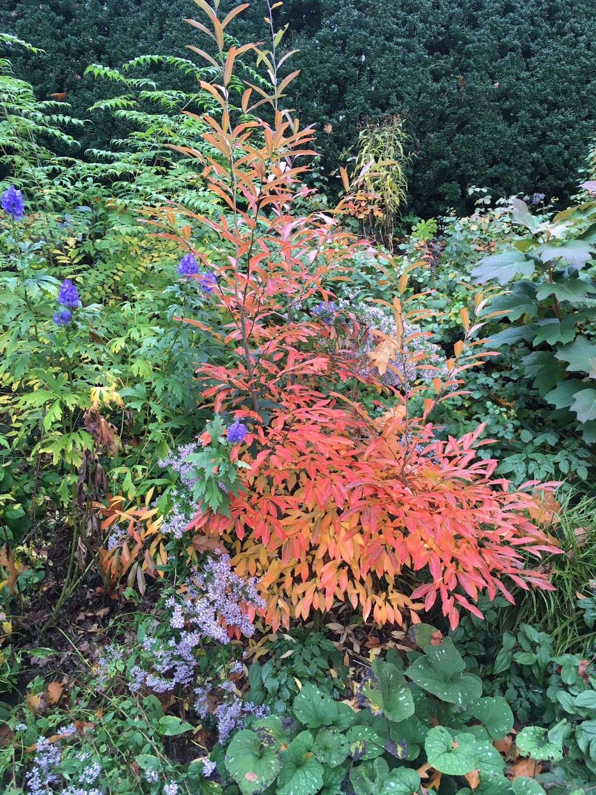 The deep red-purple foliage of Disanthus cercidifolius can be seen from every angle in the Woodland Garden right now. It suffered slightly during our summer drought but looked spectacular today. Disanthus cercidifolius has heart-shaped bluish-green leaves during the summer which are subtly attractive in the garden. It should mature to about 6-10 feet in height over time. I have under-planted it Helleborus foetidus, the stinking hellebore. The deeply-cut dark green foliage compliments the round leaves of Disanthus cercidifolius nicely. Disanthus cercidifolius has done well for me in dappled shade planted in humus-rich, moist soil.